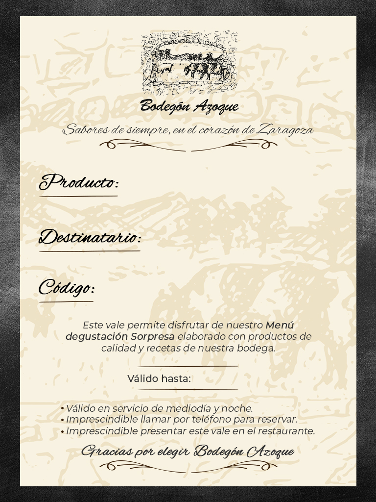 Este vale permite disfrutar de nuestro Menú degustación Sorpresa elaborado con productos de calidad y recetas de nuestra bodega.